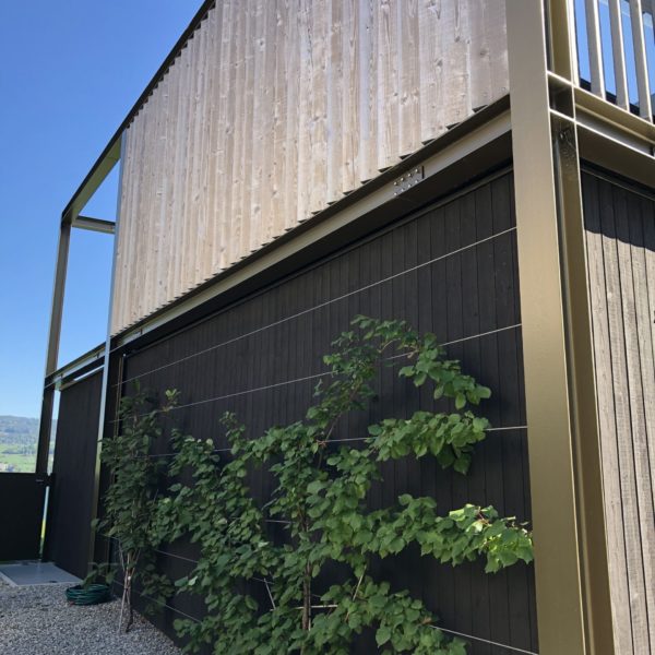 Nut-Kammschalung Weisstanne mit Schlammfarbe behandelt.