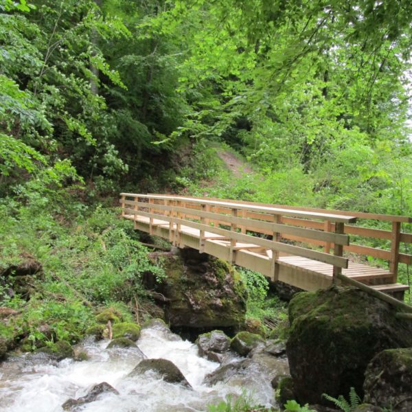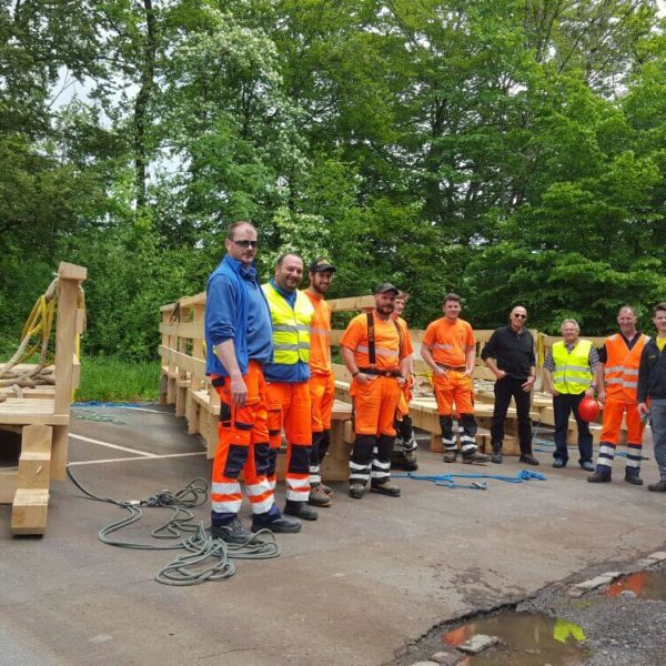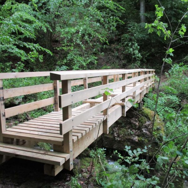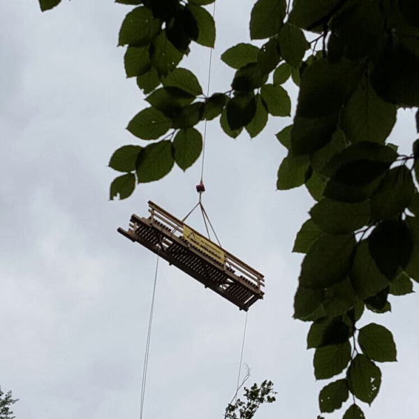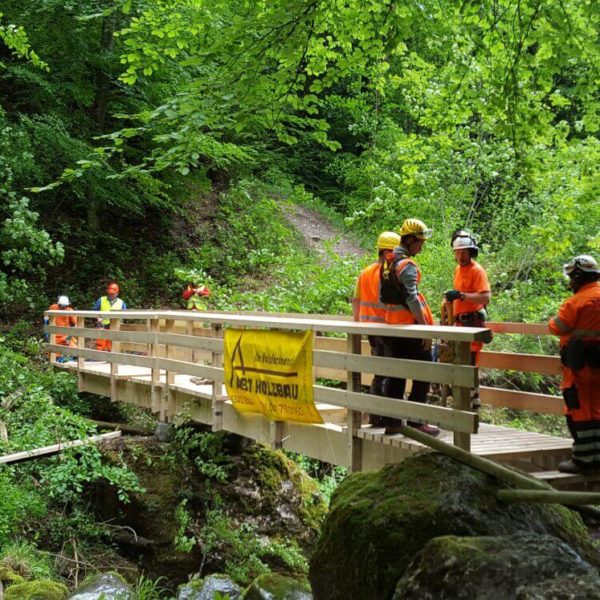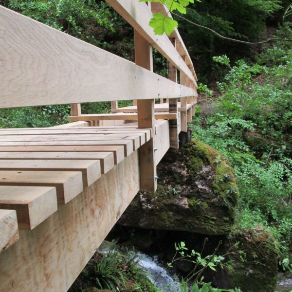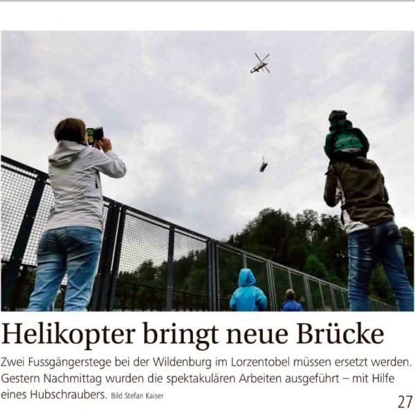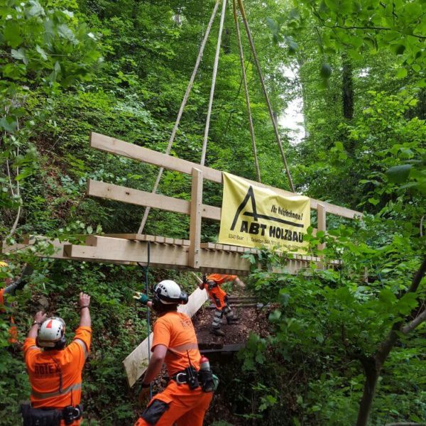 Wir haben die Ersatzbrücke aus Schweizer Eiche bei uns im Werk fertig gestellt und mit dem Hubschrauber an ihren Bestimmungsort versetzt.
