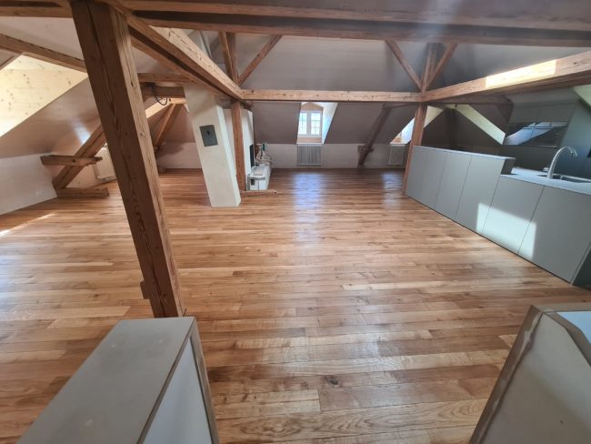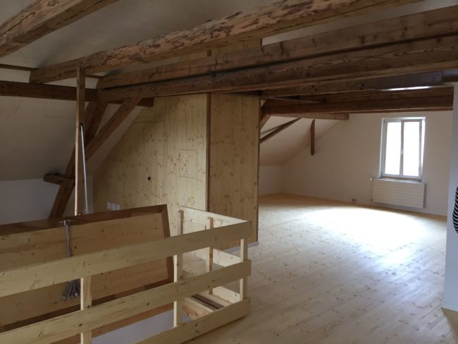 Riemenboden aus Eiche geölt, Brettstapeldecke Fichte weiss lasiert, Treppe Eiche geölt Bauherr: Y. Kirchhofer & M. Lenz Architekt: Samuel Métraux Architektur