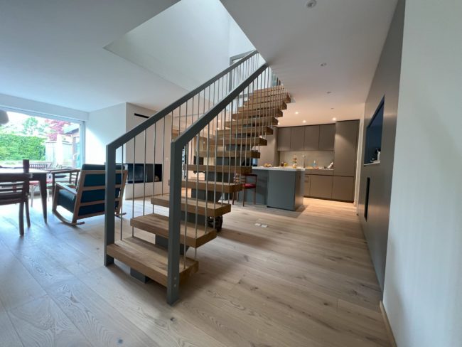 Treppe mit Massivholztritten in Eiche und anthrazitfarbenem Mittelholm. Planung: Abt Holzbau AG Bauherrschaft: privat