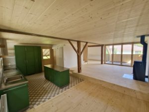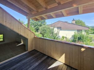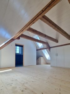 Im historischen Ökonomiegebäude wurde mit Einbezug der Denkmalpflege eine Wohnung mit Dachbalkon eingebaut.